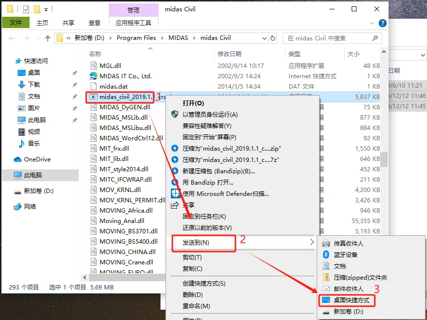 第三十二步:选中复制过来的【midas civil 2019.1.1 crack.exe】文件,依次选择【发送到】--【桌面快捷方式】。