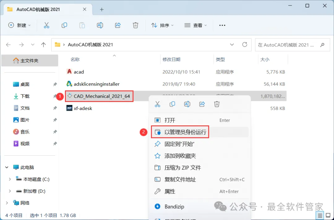 3、找到【CAD_Mechanical_2021】应用程序,右键选择【以管理员身份运行】它