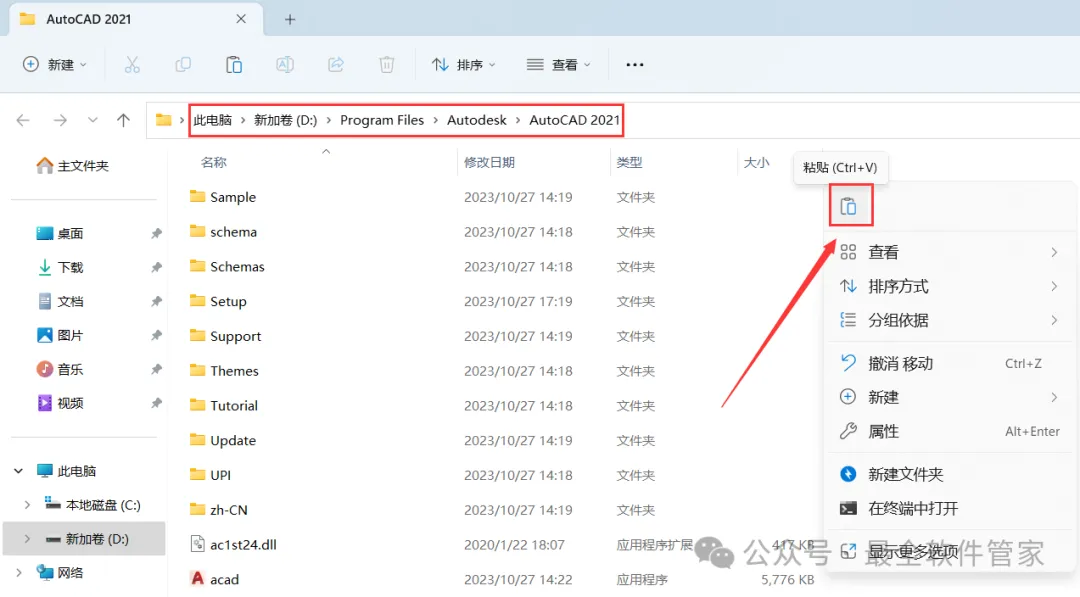 10、回到AutoCAD机械版 2021文件夹,找到【acad】程序,再右键点击【复制按钮】