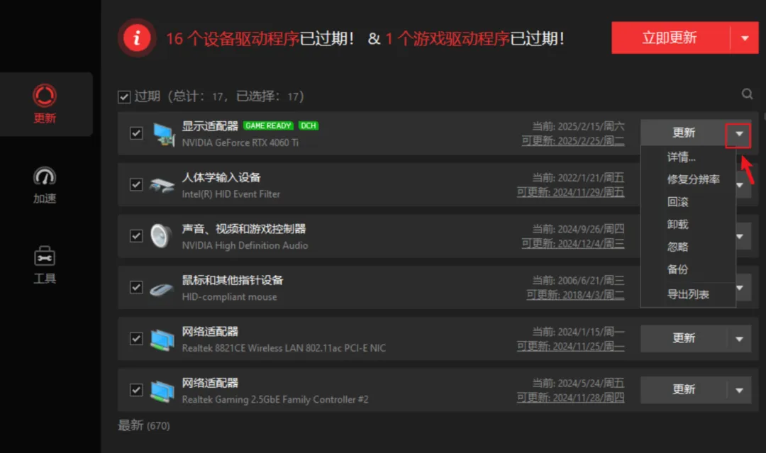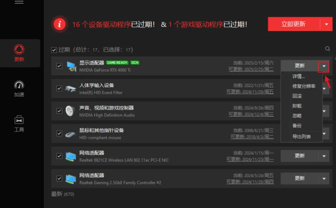 扫描完成后,哪些驱动过期一目了然,尤其是显卡驱动——对游戏体验影响巨大。点开还能看到具体版本、发布时间,甚至支持一键回滚,给你留足后悔药。