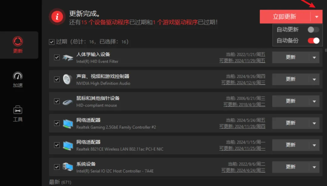 更新速度很猛,千兆宽带基本能跑满,显卡、网卡、声卡、主板都能单个手动更,也可以直接批量更新。勾上自动更新和自动备份,以后基本不用管,它自己就会盯着。