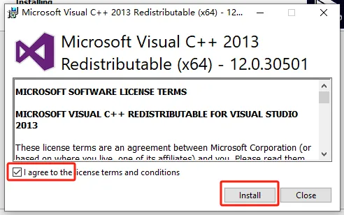 第十四步:安装过程中,可能会提示组件缺失,系统自动这安装,勾选同意,点安装,最后关闭即可。有可能会有多个组件,同意安装即可。