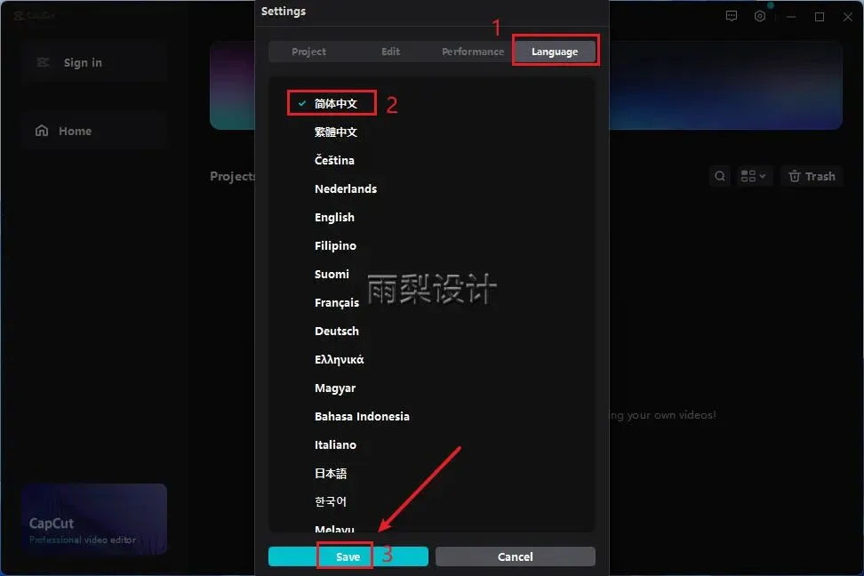 13.点击【Language】;点击【简体中文】;点击【Save】