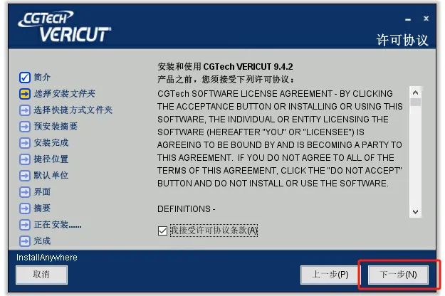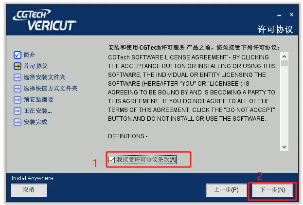 第七步:勾选【我接受许可协议条款】,点【下一步】。