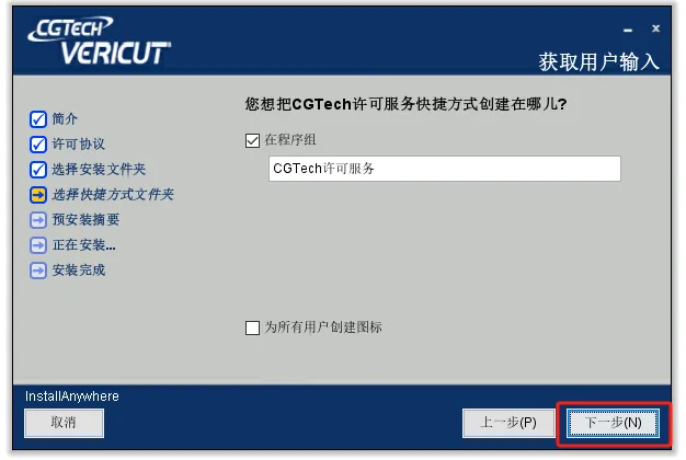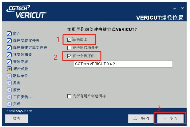 第十一步:勾选【在桌面上】和【在一个程序组】,然后点【下一步】。