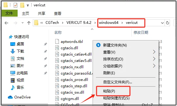 第三十四步:再打开【vericut】文件夹,将刚刚复制的【CGTech.dll】文件粘贴在此处。