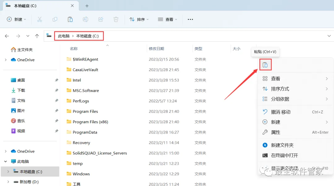 5、右键文件夹的空白处,点击【粘贴按钮】