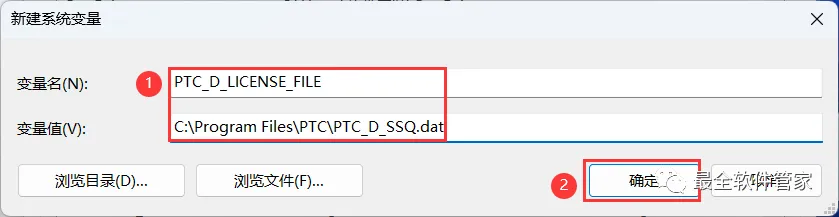 15、变量名输入:PTC_D_LICENSE_FILE;变量值输入:C:\Program Files\PTC\PTC_D_SSQ.dat,再点击【确定】
