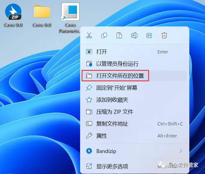 30、回到桌面,右键桌面上的【Creo 9.0软件图标】,点击【打开文件所在的位置】
