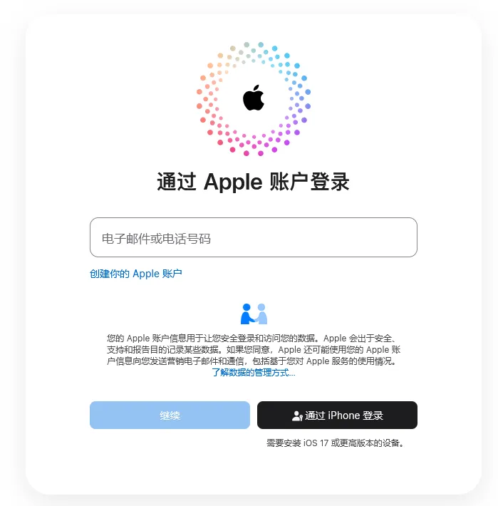 输入与iPhone同步的同一个Apple ID账号,完成安全验证后进入iCloud个人主页。