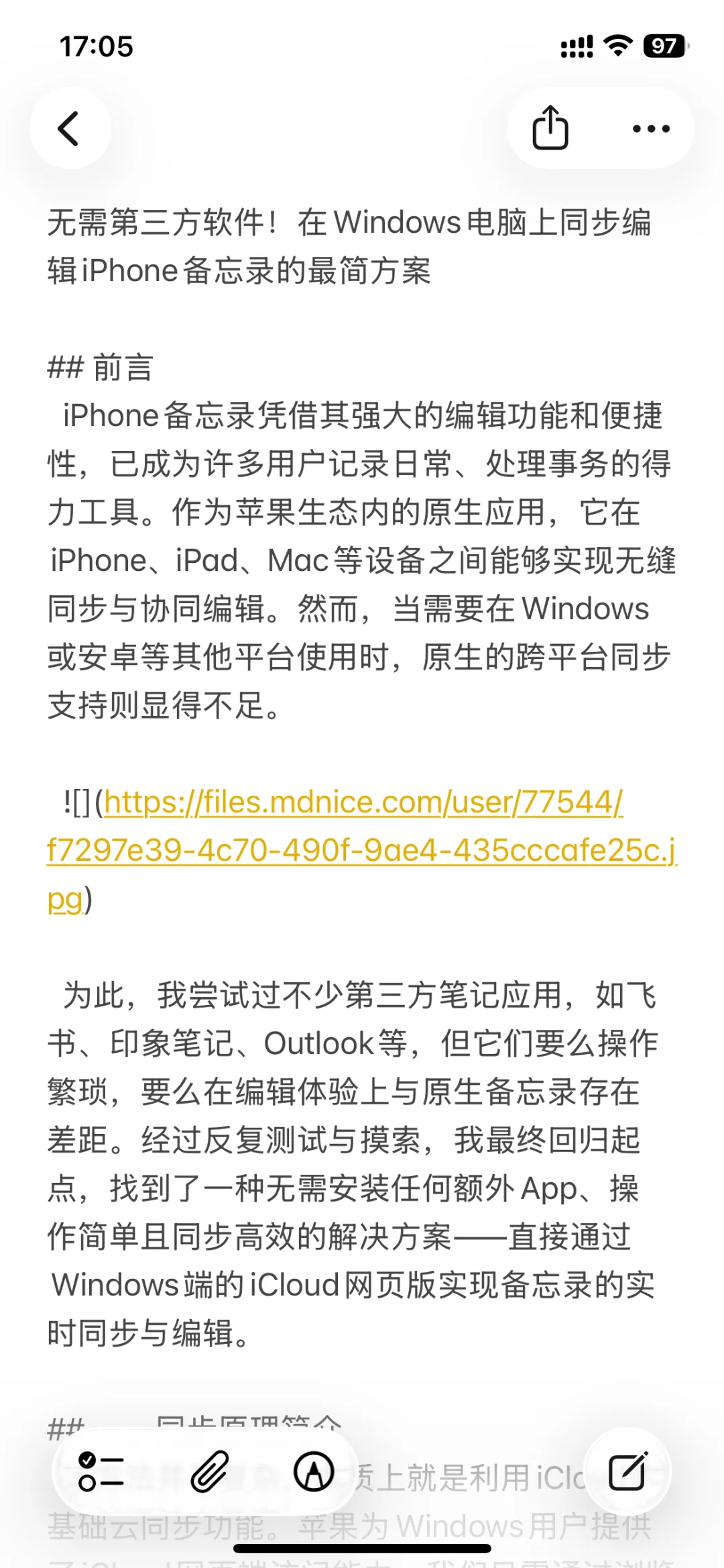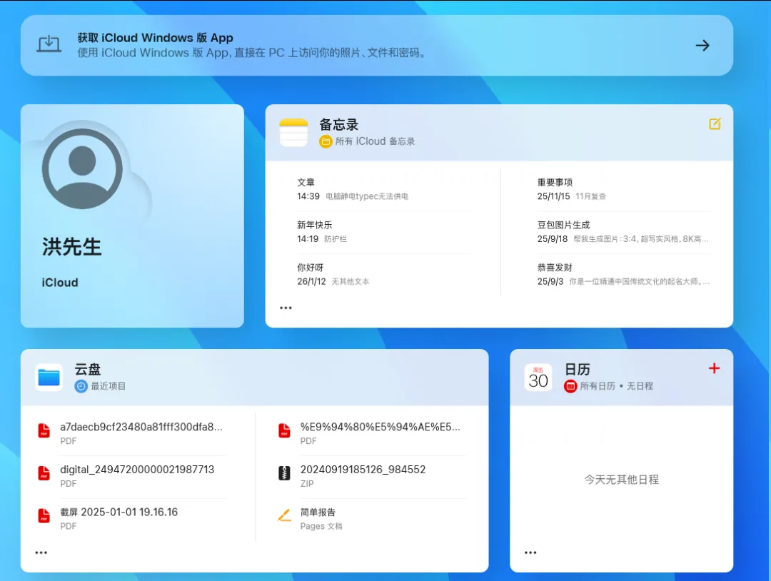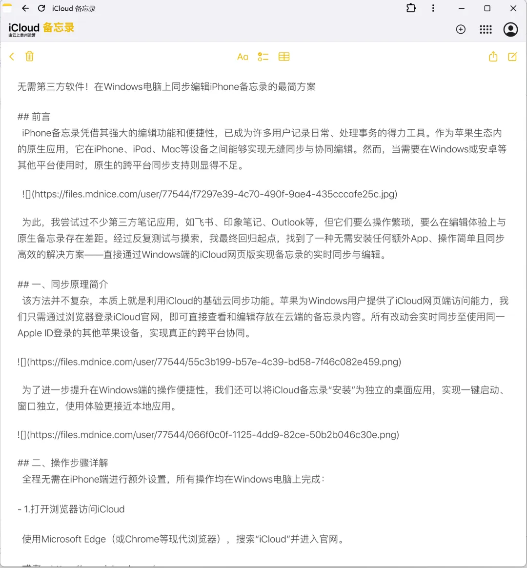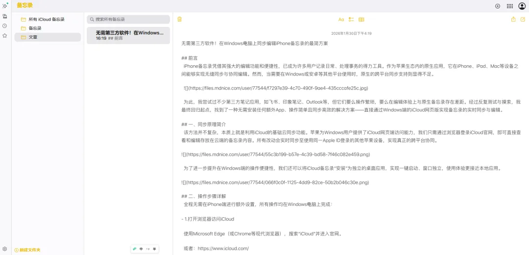 为此,我尝试过不少第三方笔记应用,如飞书、印象笔记、Outlook等,但它们要么操作繁琐,要么在编辑体验上与原生备忘录存在差距。经过反复测试与摸索,我最终回归起点,找到了一种无需安装任何额外App、操作简单且同步高效的解决方案——直接通过Windows端的iCloud网页版实现备忘录的实时同步与编辑。