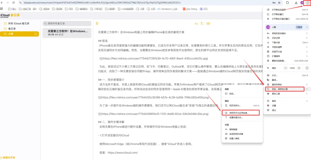 为了进一步提升在Windows端的操作便捷性,我们还可以将iCloud备忘录“安装”为独立的桌面应用,实现一键启动、窗口独立,使用体验更接近本地应用。