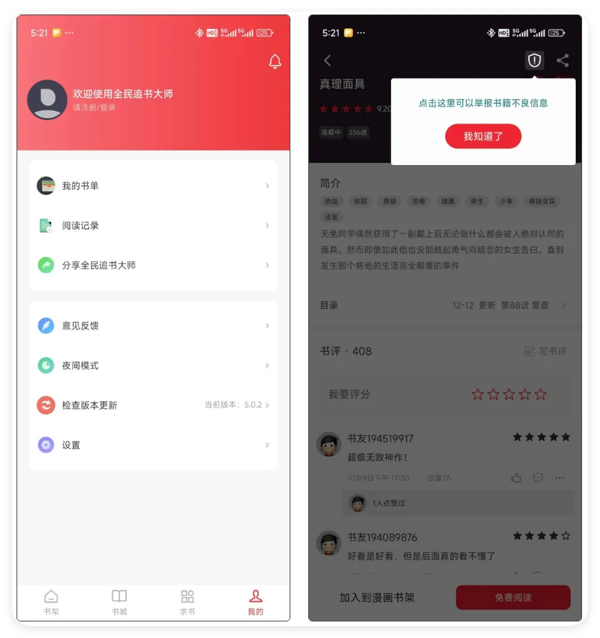 总的来说,全民追书大师就是那种“简单、干净、没套路”的工具型App——完全免费,没有付费墙,也没有弹窗广告,纯粹就是让你安安静静看书、看漫画。在这个动不动就搞会员、塞广告的时代,这样的阅读App真的不多见了。