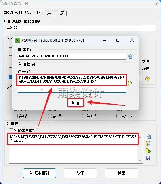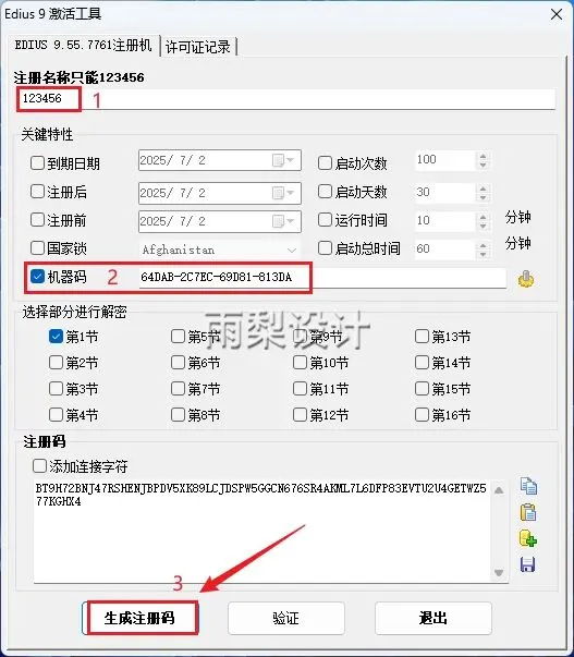 10.①名称输入【123456】;②勾选【机器码】并输入【粘贴第7步的机器码】;③点击【生成注册码】