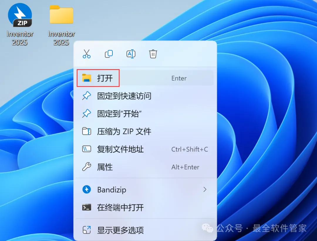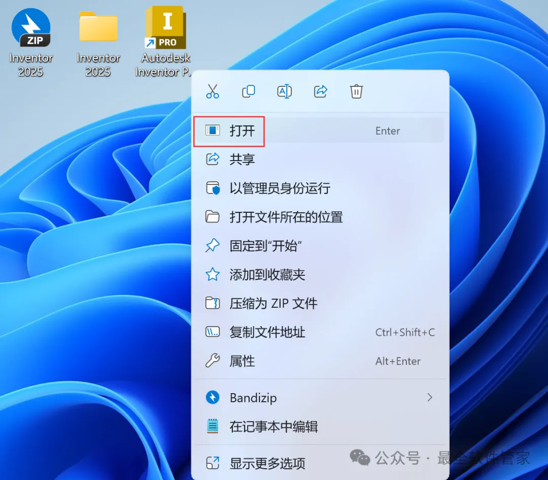 12、回到桌面,右键桌面上的【Inventor 2025软件图标】,点击【打开】
