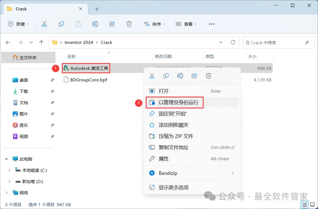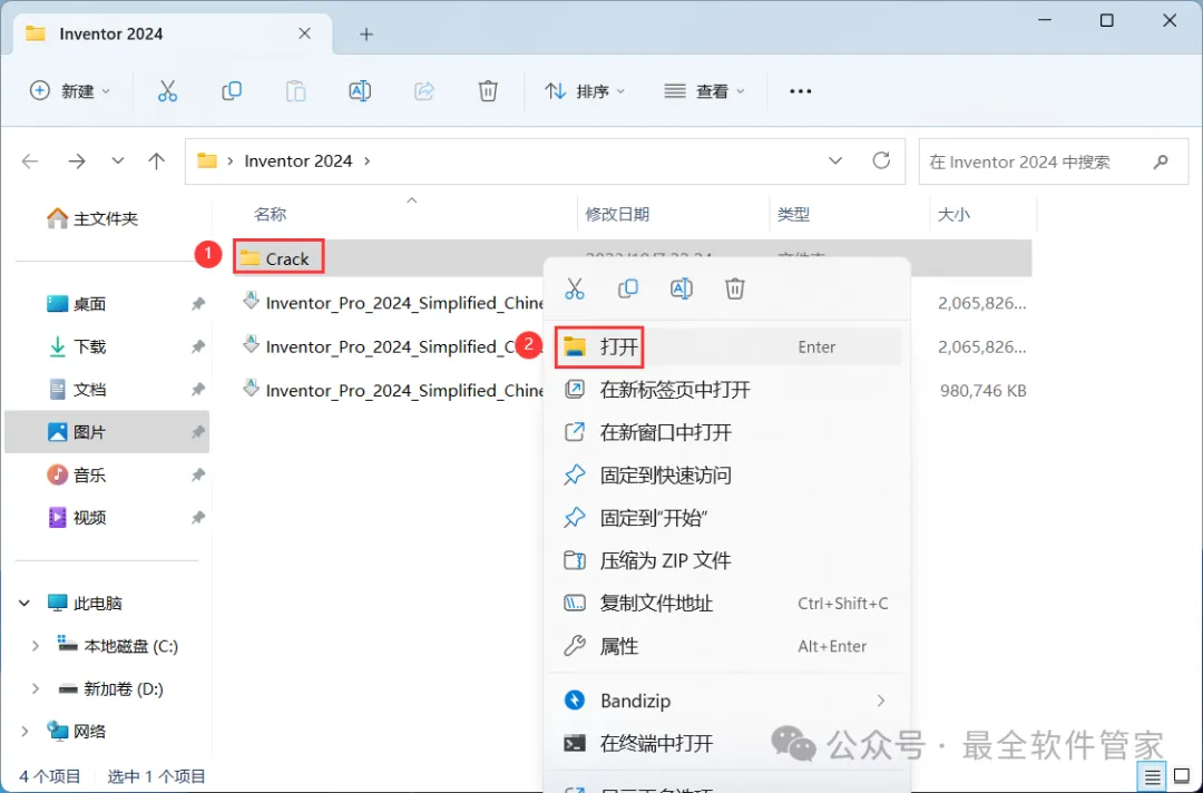10、回到Inventor 2024文件夹,找到【Crack】文件夹,右键【打开】它