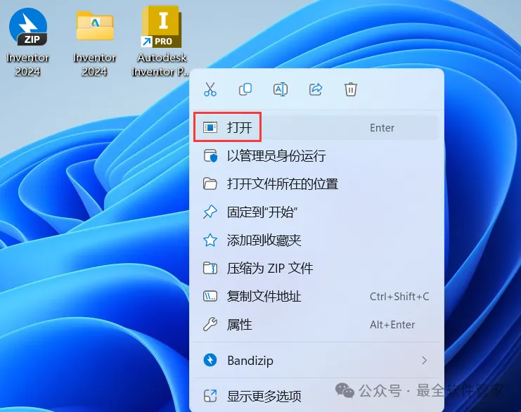 15、回到桌面,右键桌面上的【Inventor 2024软件图标】,点击【打开】