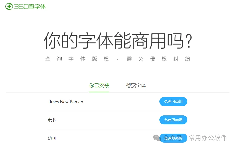 严格来说这不是一款软件,是一个查字体版权的网站,你既可以使用它查看“已安装的字体”可免费商用还是需授权,也可以找到一些免费可商用的字体。比如像思源黑体,站酷酷黑,都是免费可商用的。这个网站最大的意义就是可以免遭字体侵权。