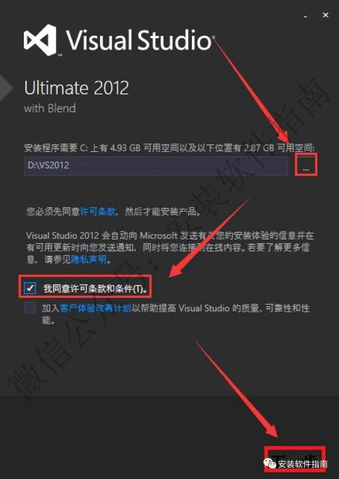 6.点【...】选择软件安装路径(建议安装在D盘里新建一个VS2012的文件夹),点【我同意许可条款和条件】,完成后点【下一步】