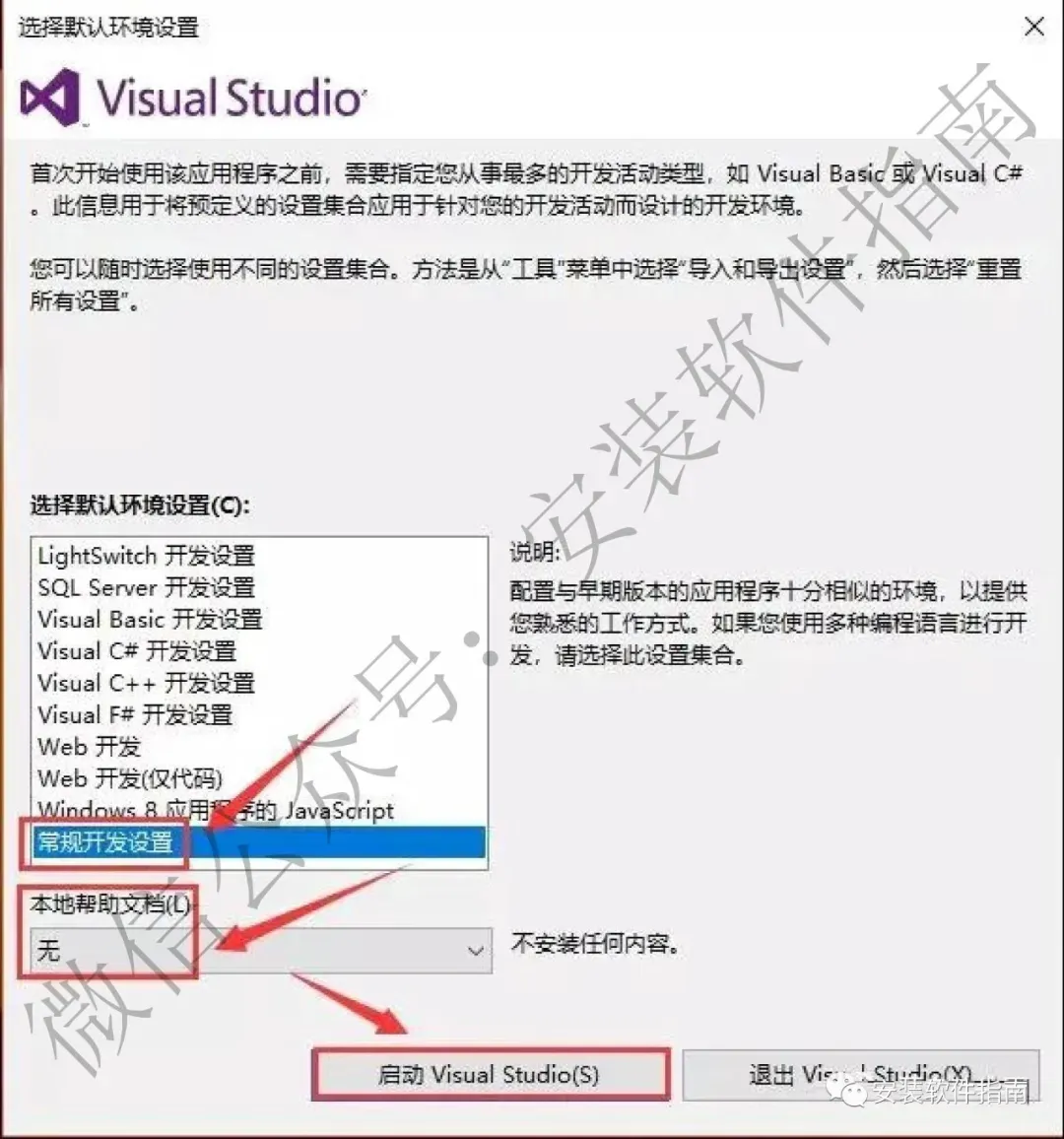 15.点【常规开发设置】,本地帮助文档选择【无】,点【启动Visual Studio】