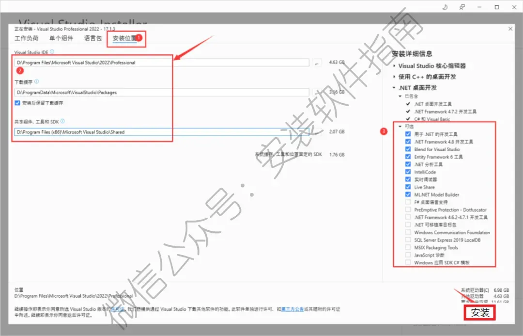 7、选择【安装位置】选择软件的安装位置(如:将C改为D表示安装到D盘),继续勾选自己所需的插件,然后点击【安装】