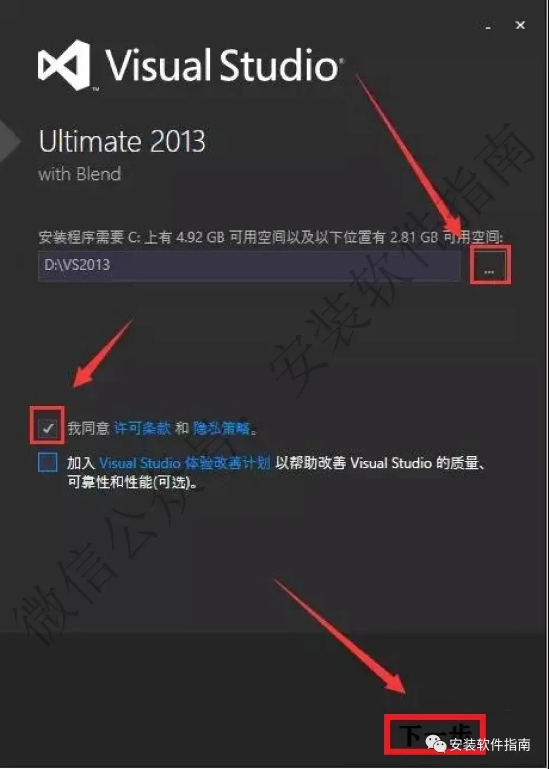 6.点【...】选择软件安装路径(建议安装在D盘里新建一个VS2013的文件夹),点【我同意许可条款和隐私策略】,完成后点【下一步】