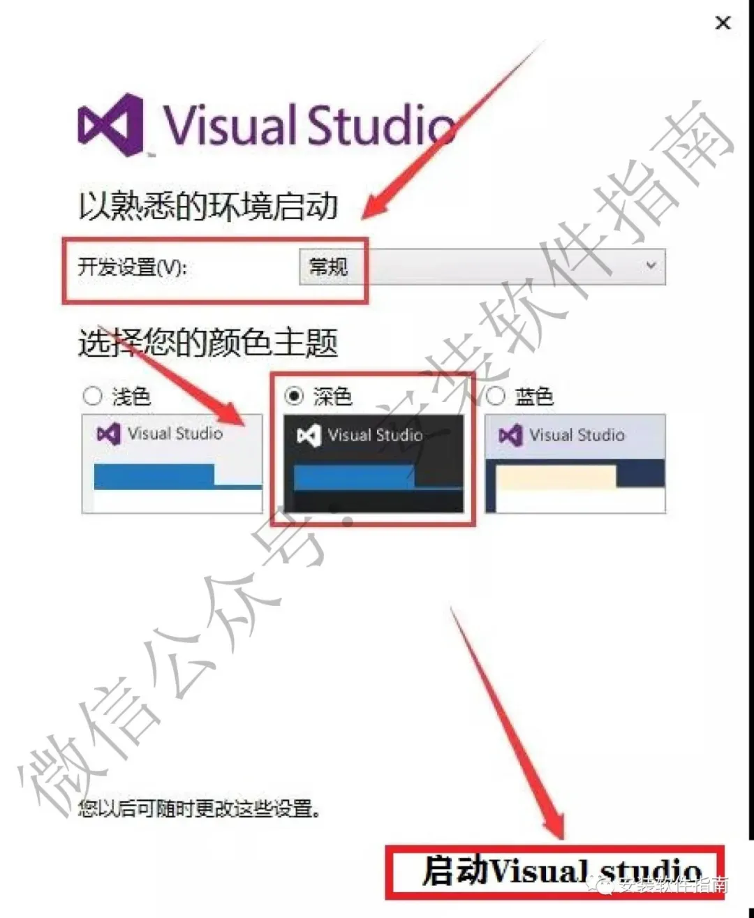 12.将【开发设置】和【颜色主题】选好后,点【启动Visual Studio】