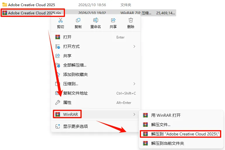 1.选中下载的压缩包,然后鼠标右键选择解压到“Adobe Creative Cloud 2025”(没有解压选项点这里)