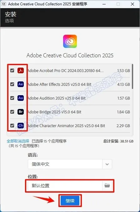 3.勾选想要安装的软件(教程以Au安装为例),默认为全选,可以选择软件安装路径,点击“继续”