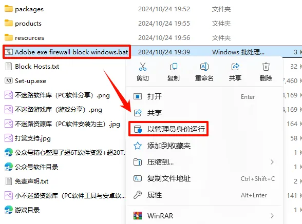 打开“Adobe Creative Cloud2025 v23.10.2024”文件夹,选中“Adobe exe firewall block windows.bat”文件,鼠标右键选择“以管理员身份运行”