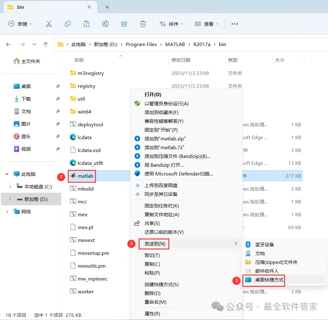19、找到【matlab】程序,右键依次点击【显示更多选项】、【发送到】、【桌面快捷方式】,完成软件桌面快捷方式的创建