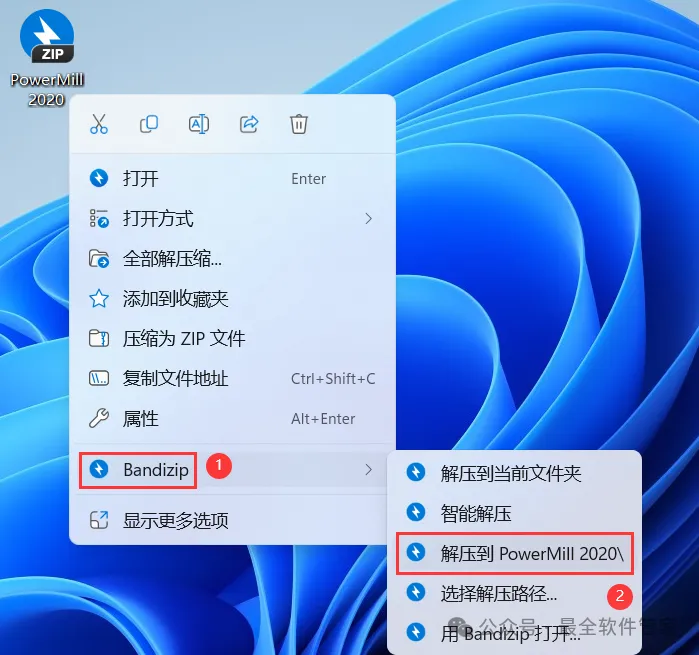 1、下载PowerMill 2020软件安装包到电脑上,右键选择【解压到PowerMill 2020\】