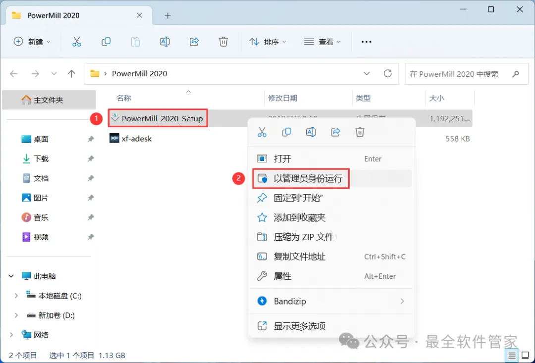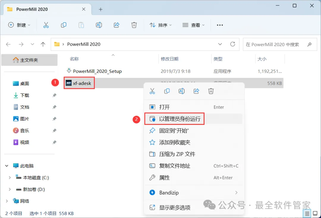 20、回到PowerMill 2020文件夹,找到【xf-adesk】程序,右键选择【以管理员身份运行】它