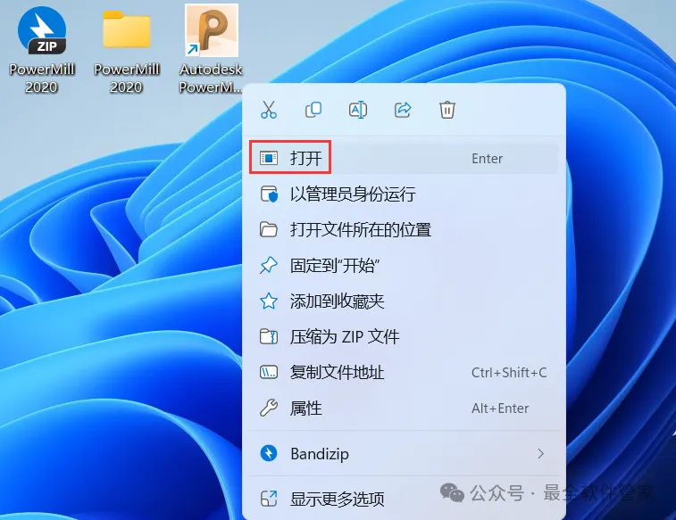 10、回到桌面,右键桌面上的【PowerMill 2020软件图标】,点击【打开】