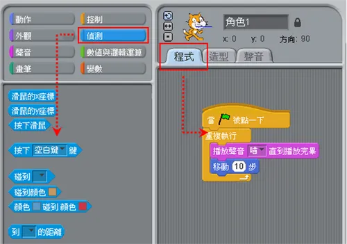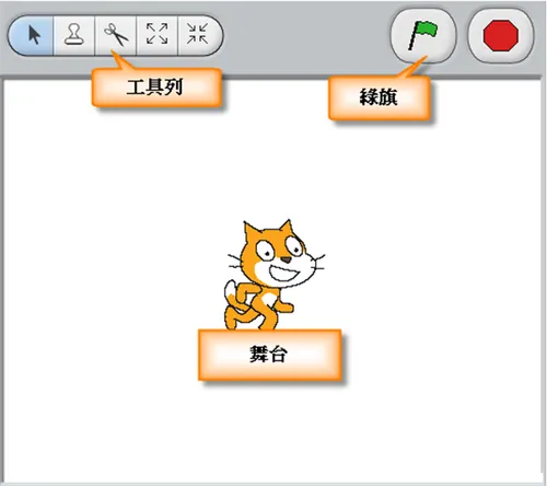 同时说明了各模块的基础使用方法,比如指令可拖曳至程式码区编写程序,造型和声音支持绘制、录音或汇入,舞台通过绿旗和红按钮控制程序启停,角色及背景也能自主创建、汇入或随机添加。