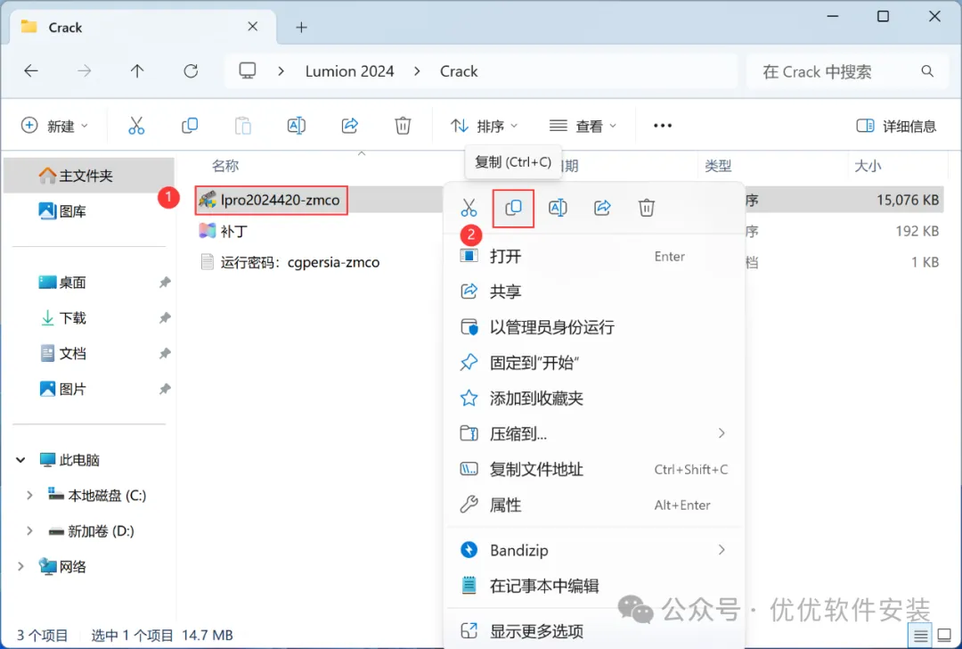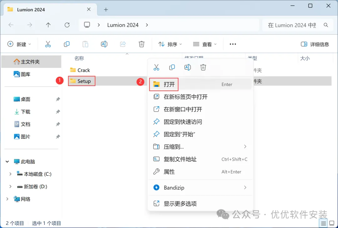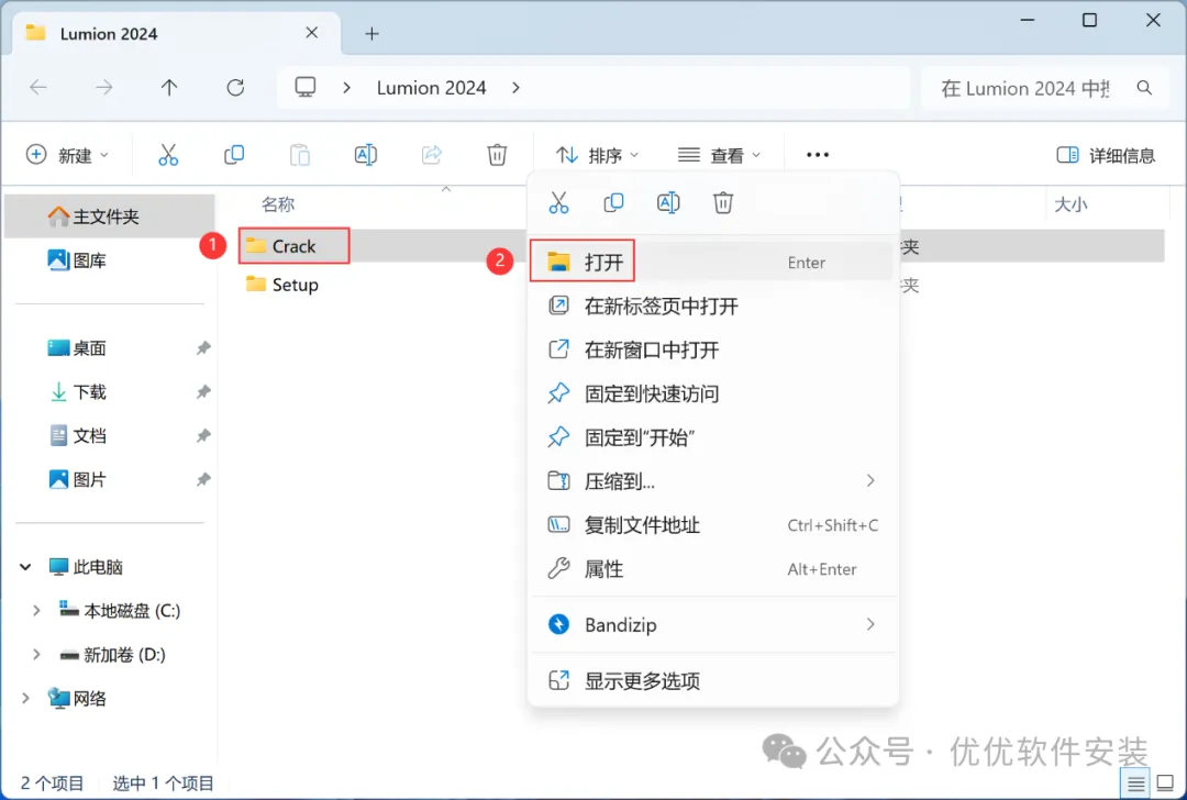 6、回到Lumion 2024文件夹,找到【Crack】文件夹,右键【打开】它