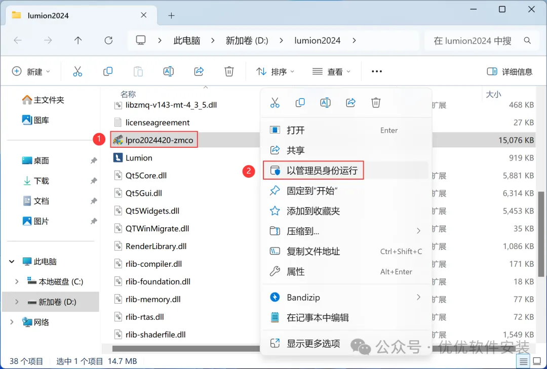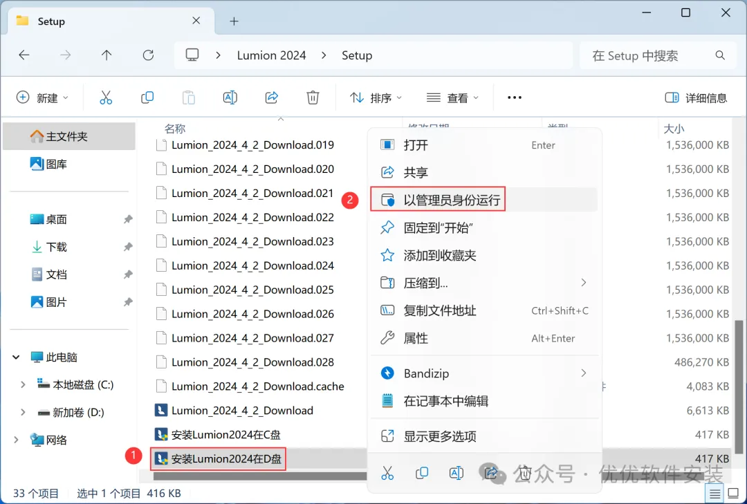 4、找到【安装Lumion2024在D盘】应用程序,右键选择【以管理员身份运行】它
