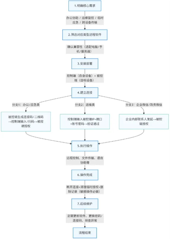 这个流程看似简单,但不同类型的软件,操作细节、授权方式、稳定性差异很大——比如办公类软件多是“连接码/扫码”快速连接,无需复杂配置,适合小白;运维类软件多是“IP+端口+密码”精准连接,需要提前配置权限和端口,适合技术人员;企业微信/政务微信无需额外安装,直接在办公软件内发起,适合企业内部应急协助。掌握这个通用流程,不管用哪款软件,都能快速上手,避免因为操作不熟练而耽误时间。比如办公族用ToDesk、向日葵,按照流程安装后,通过连接码就能快速建立连接,全程不到1分钟;运维人员用TeamViewer、AnyDesk,输入服务器IP和密码,验证通过后就能稳定操作,无需多余步骤;企业内部员工用企业微信远程协助,一键发起请求,同事授权后就能快速协助处理问题,极大提升了协作效率。同时,流程中“操作完成后断开连接、清理授权”这一步非常重要,尤其是处理敏感工作、管控服务器时,能有效避免他人误操作或恶意连接,保障数据安全。