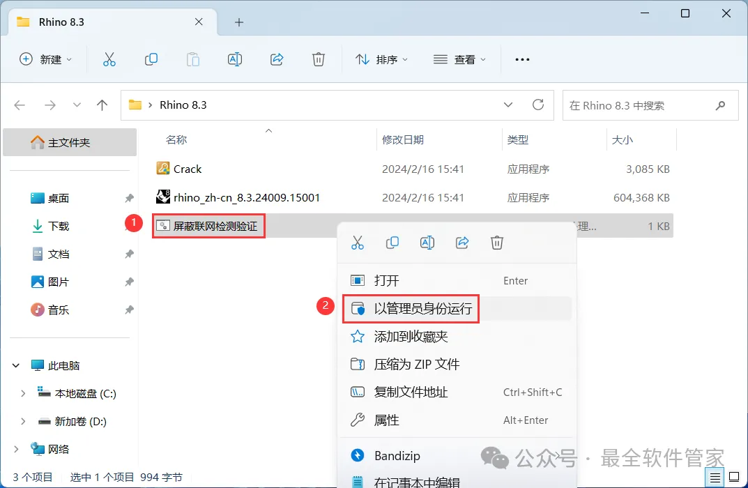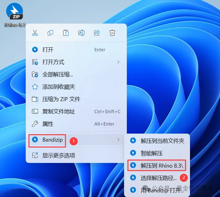 1、下载Rhino 8.3软件安装包到电脑上,右键选择【解压到Rhino 8.3\】