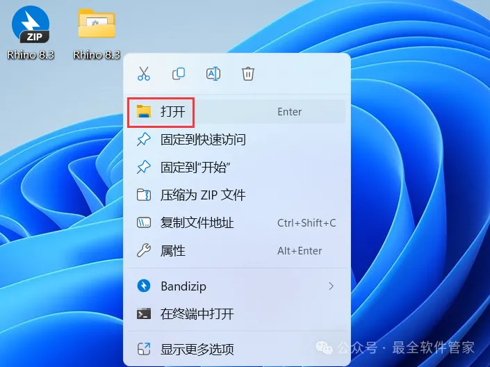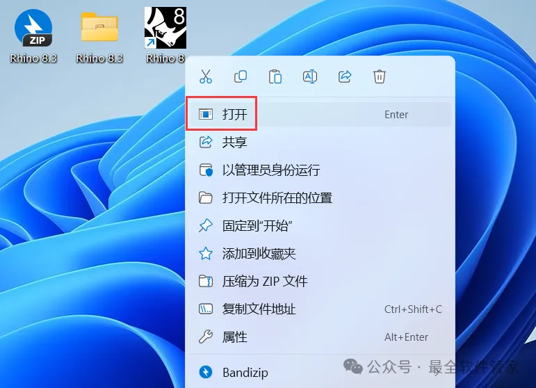 13、回到桌面,右键桌面上的【Rhino 8软件图标】,点击【打开】