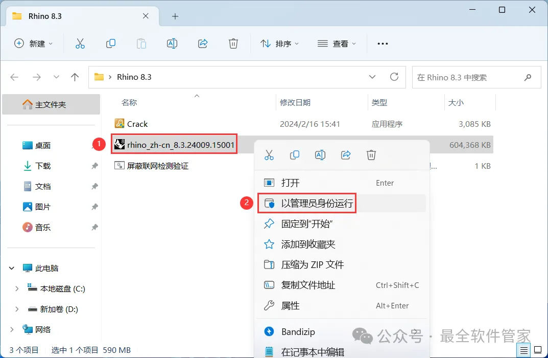 4、找到【rhino_zh-cn_8.3】应用程序,右键选择【以管理员身份运行】它