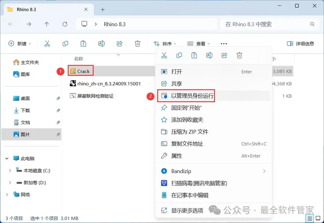 9、回到Rhino 8.3文件夹,找到【Crack】程序,右键选择【以管理员身份运行】它