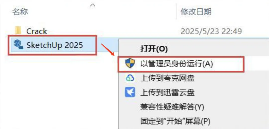 2、解压文件:将下载好的压缩包解压。右键点击程序:SketchUp 2025,选择:以管理员身份运行。