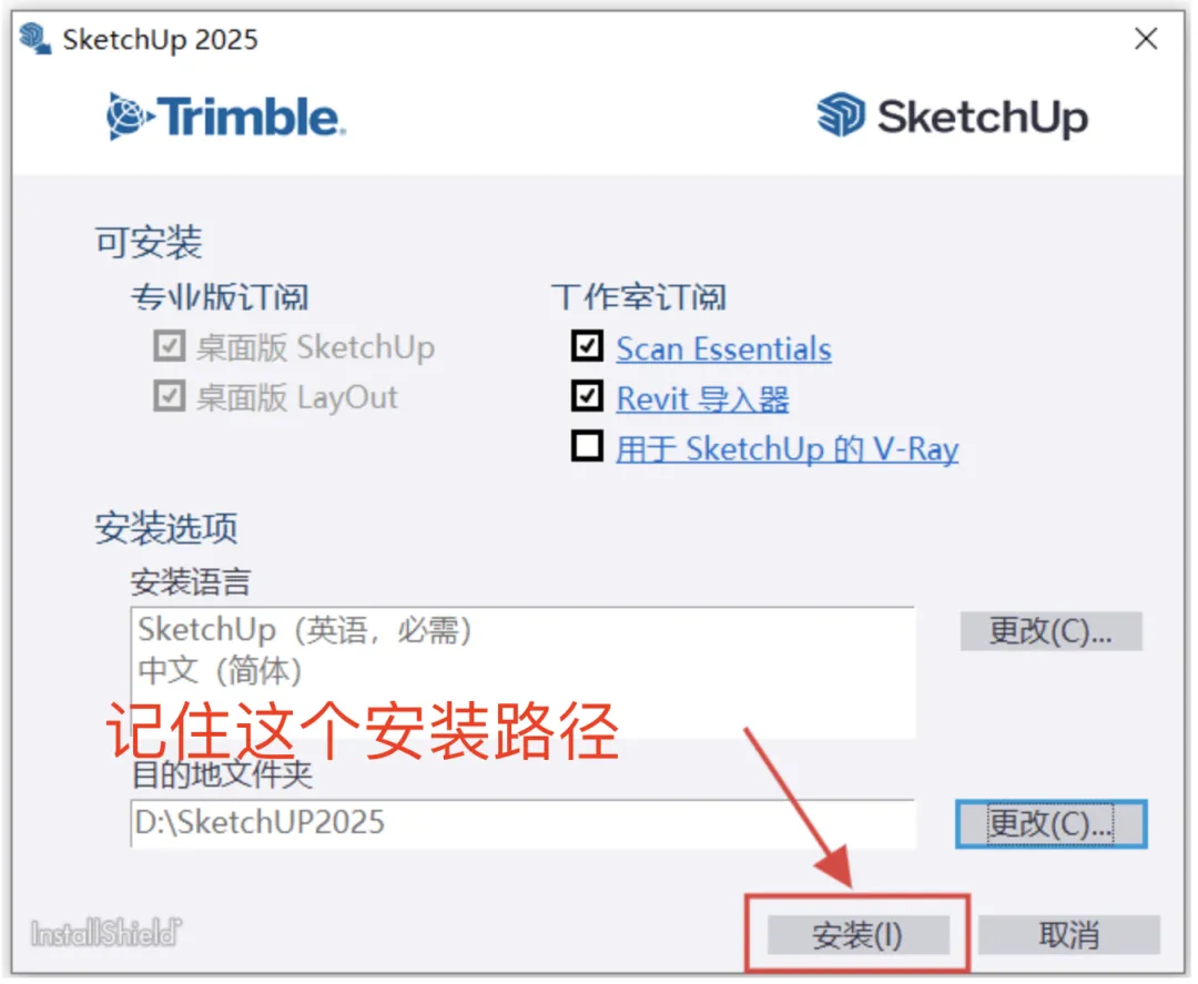 在安装选项界面,取消勾选:用于SketchUp的 V-Ray,