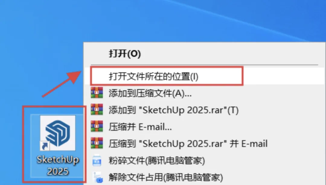 在电脑桌面上找到软件快捷方式:SketchUp 2025,右键点击它,选择:打开文件所在的位置。