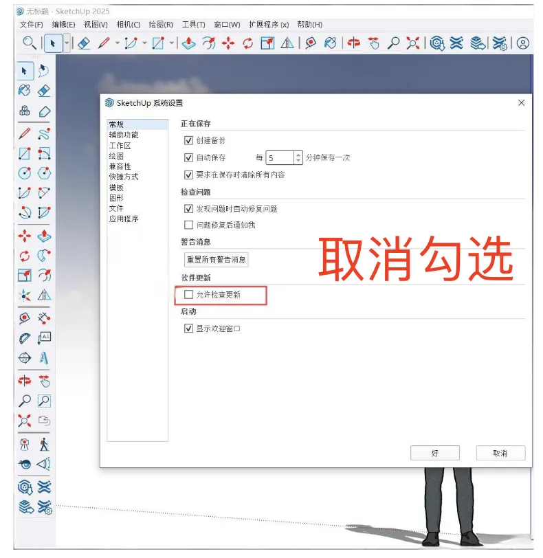 在设置窗口中,找到:软件更新选项,取消勾选:允许检查更新。