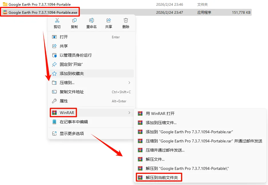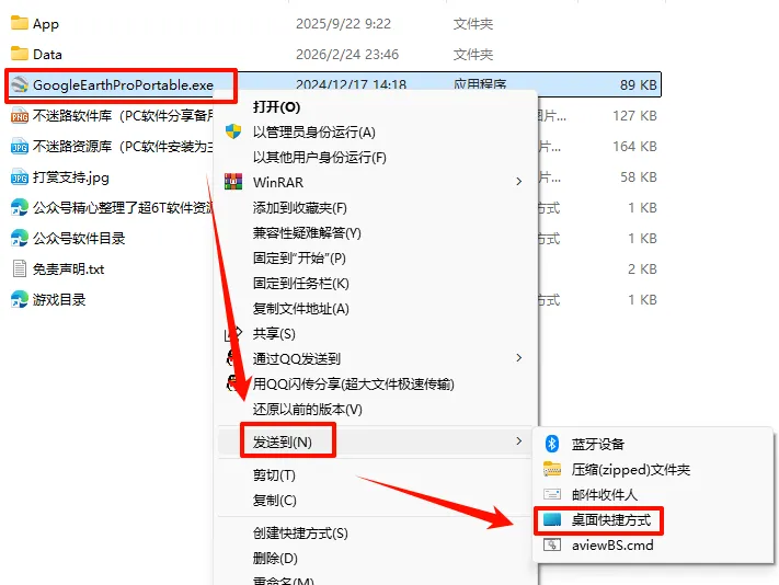2.打开刚刚解压的文件夹,鼠标右键点击“GoogleEarthProPortable.exe”文件,点击“发送到”,点击“桌面快捷方式“