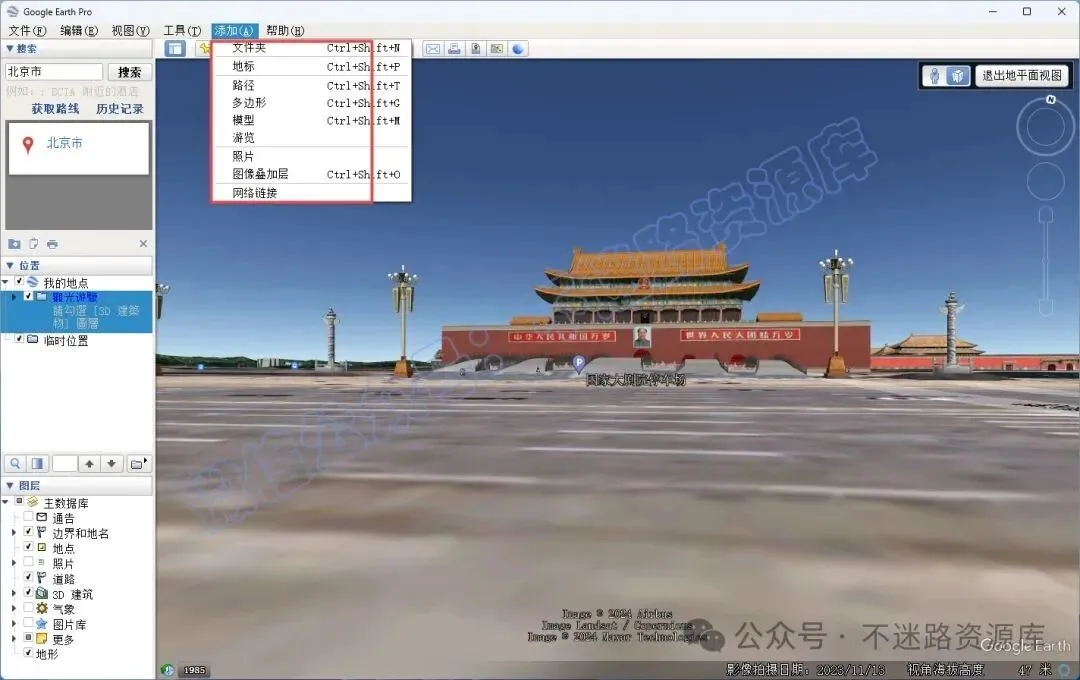 7、点击菜单栏中的绘制多边形、添加地标功能,可在谷歌地球中绘制多边形以及添加地标,并保存至左侧位置窗口,在左侧位置窗口双击添加的多边形或地标即可快速到达目标所在位置。