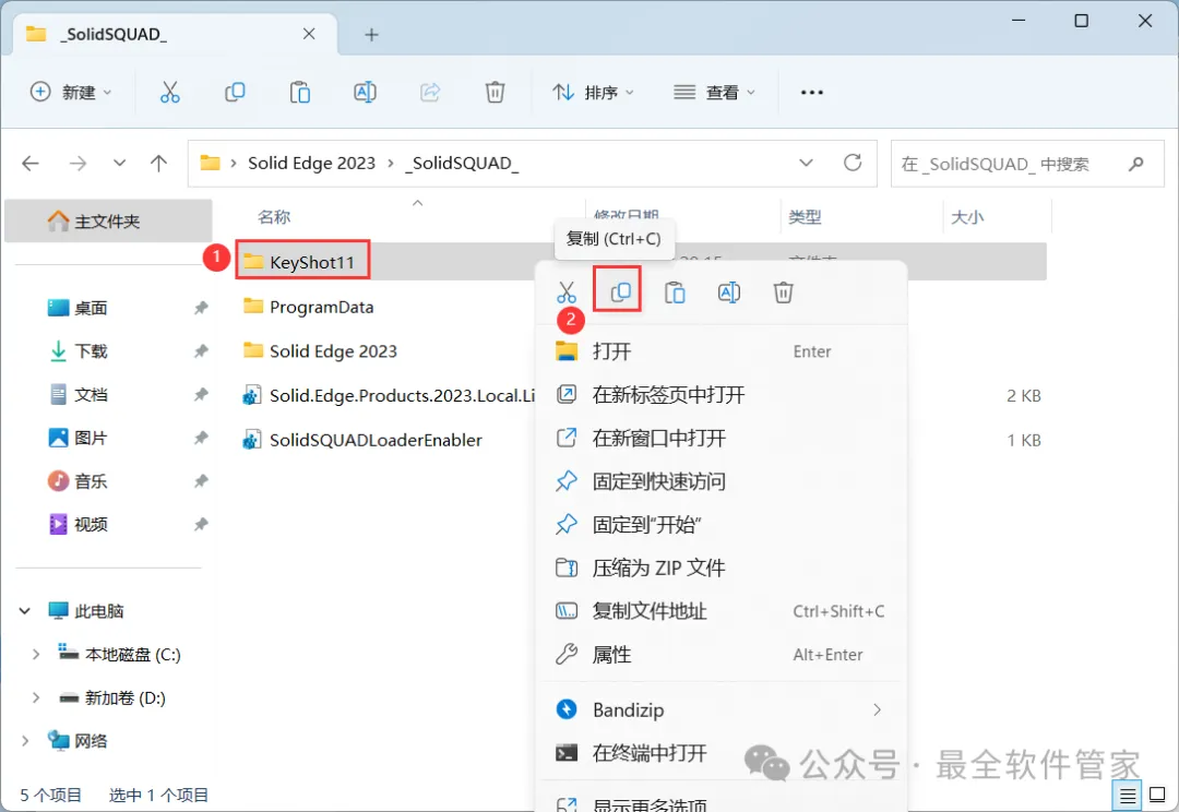 14、回到_SolidSQUAD_文件夹,找到【KeyShot11】文件夹,右键点击【复制按钮】