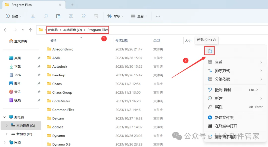 15、打开路径:C:\Program Files,再右键文件夹的空白处,点击【粘贴按钮】